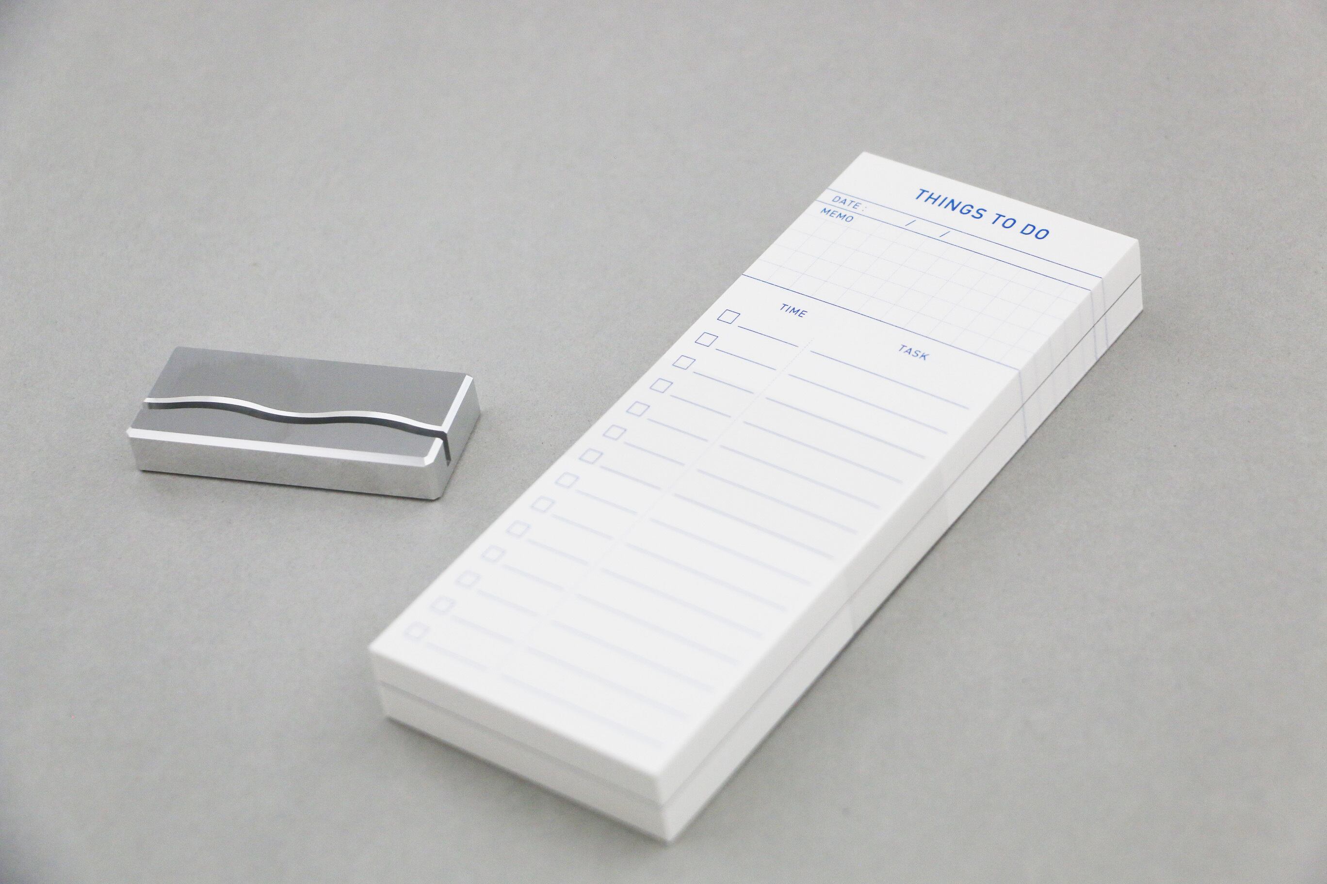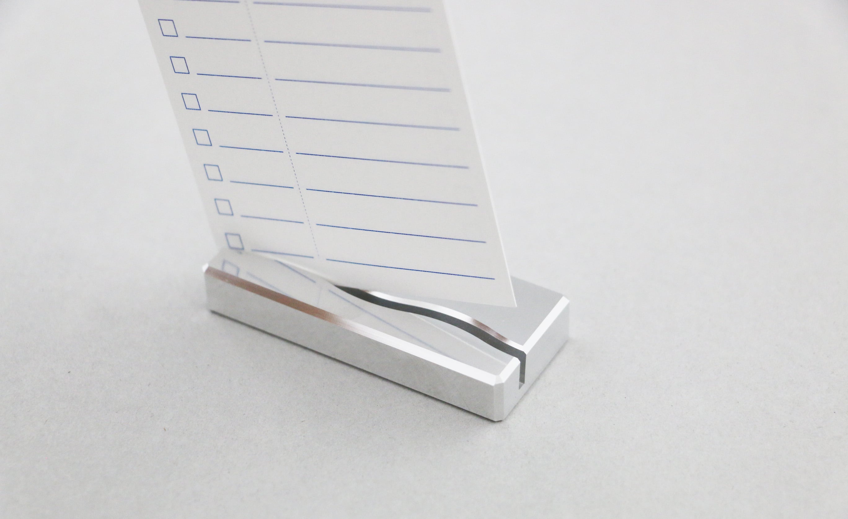 1日のタスクをメモして、片付いたタスクにチェックを入れていけば、頭の中も整理されて、すっきり。シンプルで使いやすいデザインのタスクメモを、メタルスタンドの溝に入れて立てると、いつでも今日のタスクをチェックできて、スタイリッシュで洗練されたインテリアの一部にも。場所を取らずにデスクや棚に置けるサイズで、いつでも簡単にタスクを確認できます。両面印刷のため、1枚で2日分使用可能(全62枚収納 / 4ヶ月分)。メタルスタンドの溝は波線形で、金属加工職人によって製作されたこだわりの一品です。写真や伝言メモ、メッセージカードを立てたり、他の用途にも使えます。