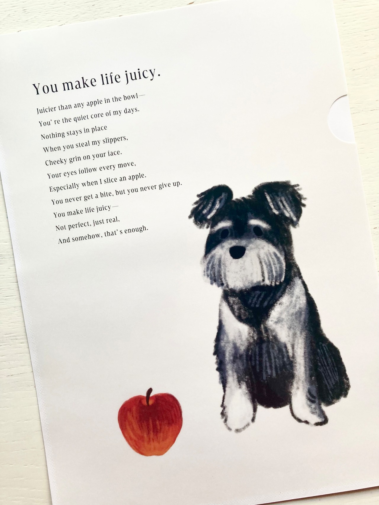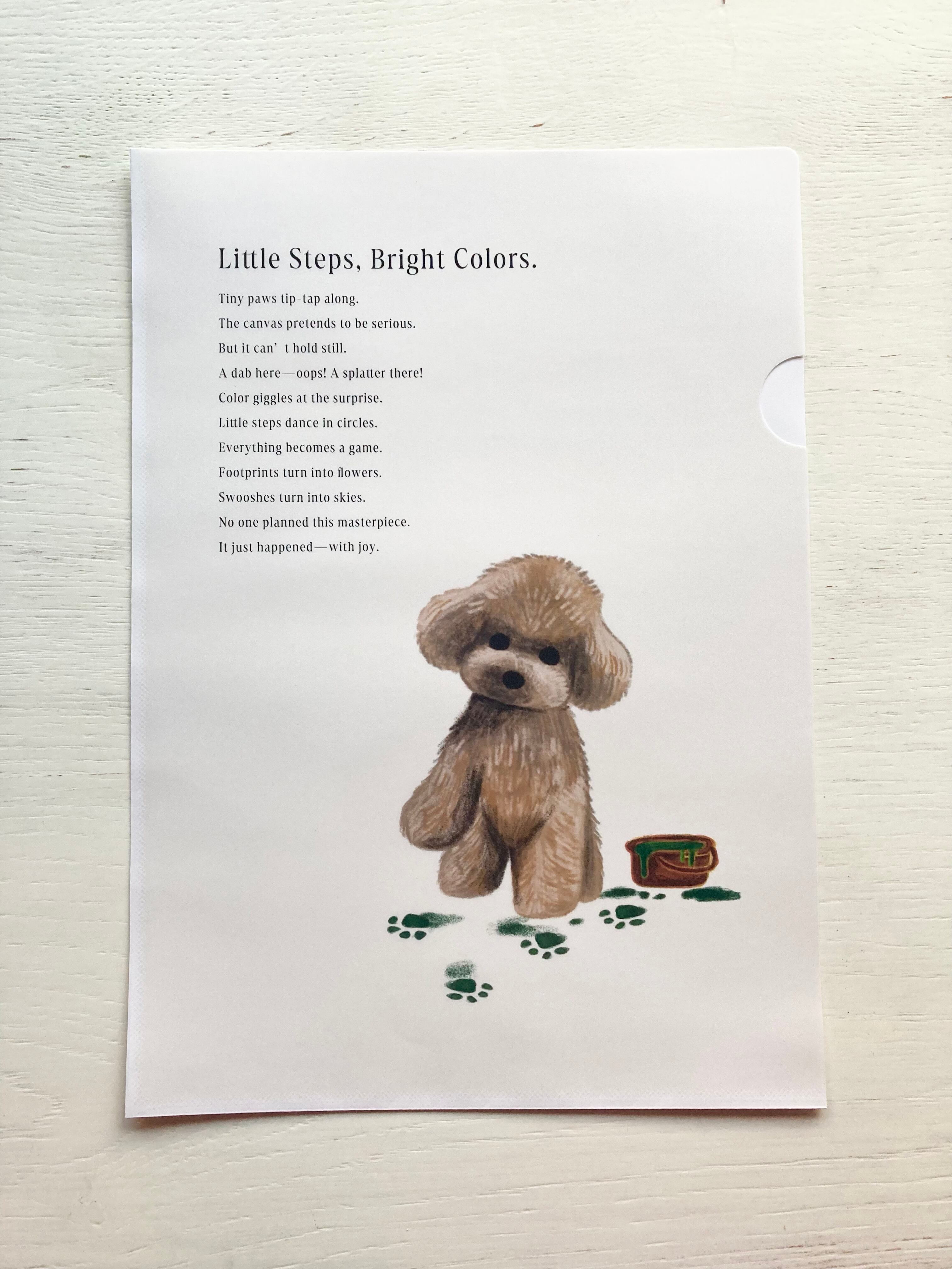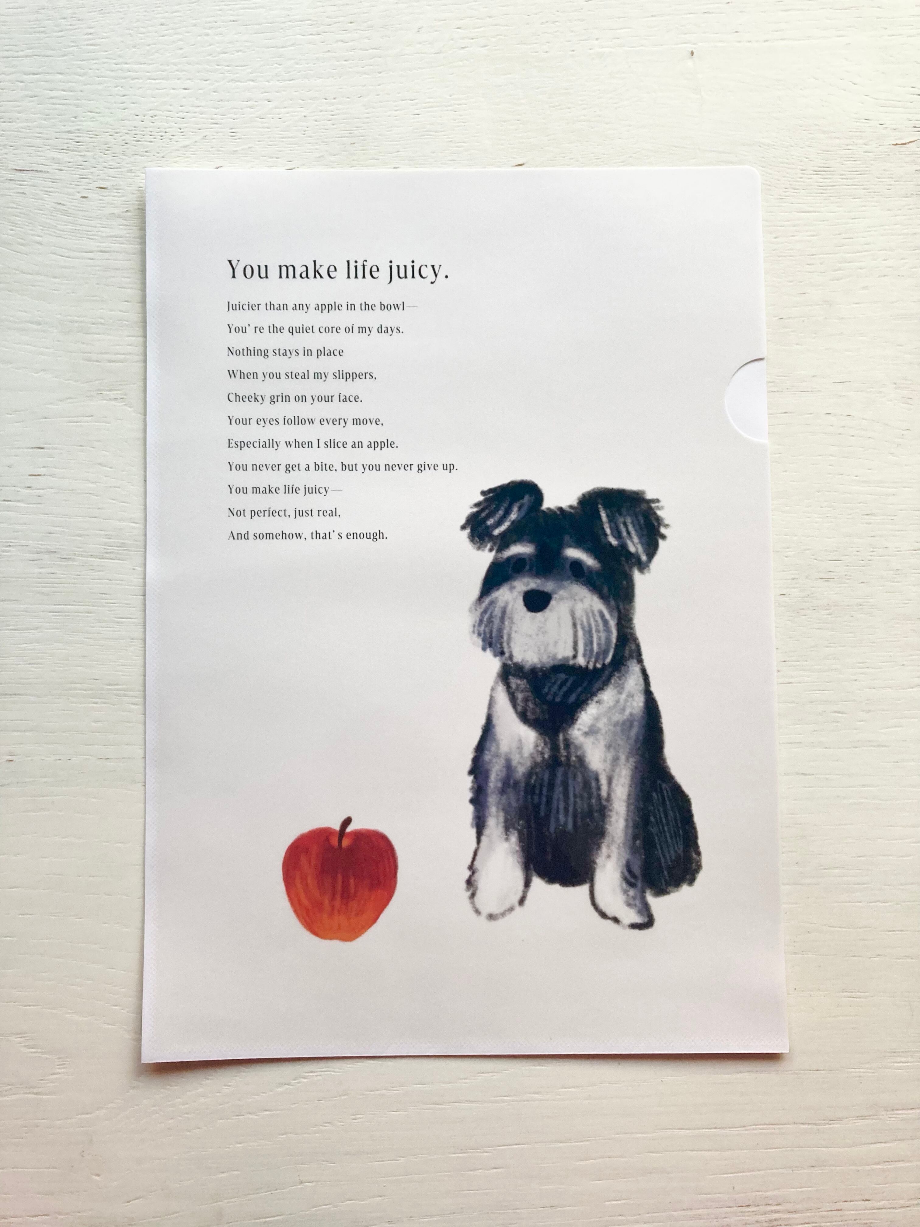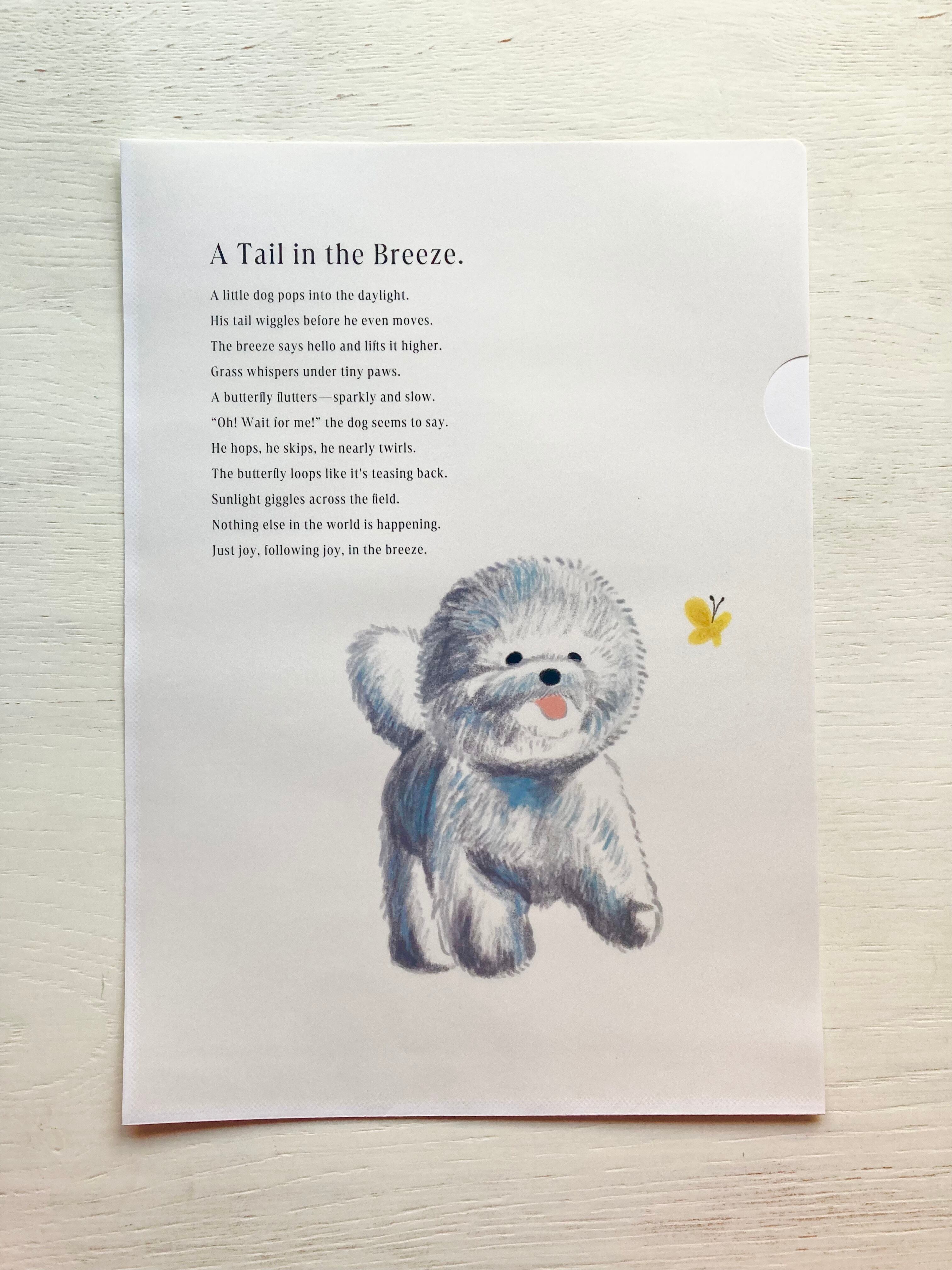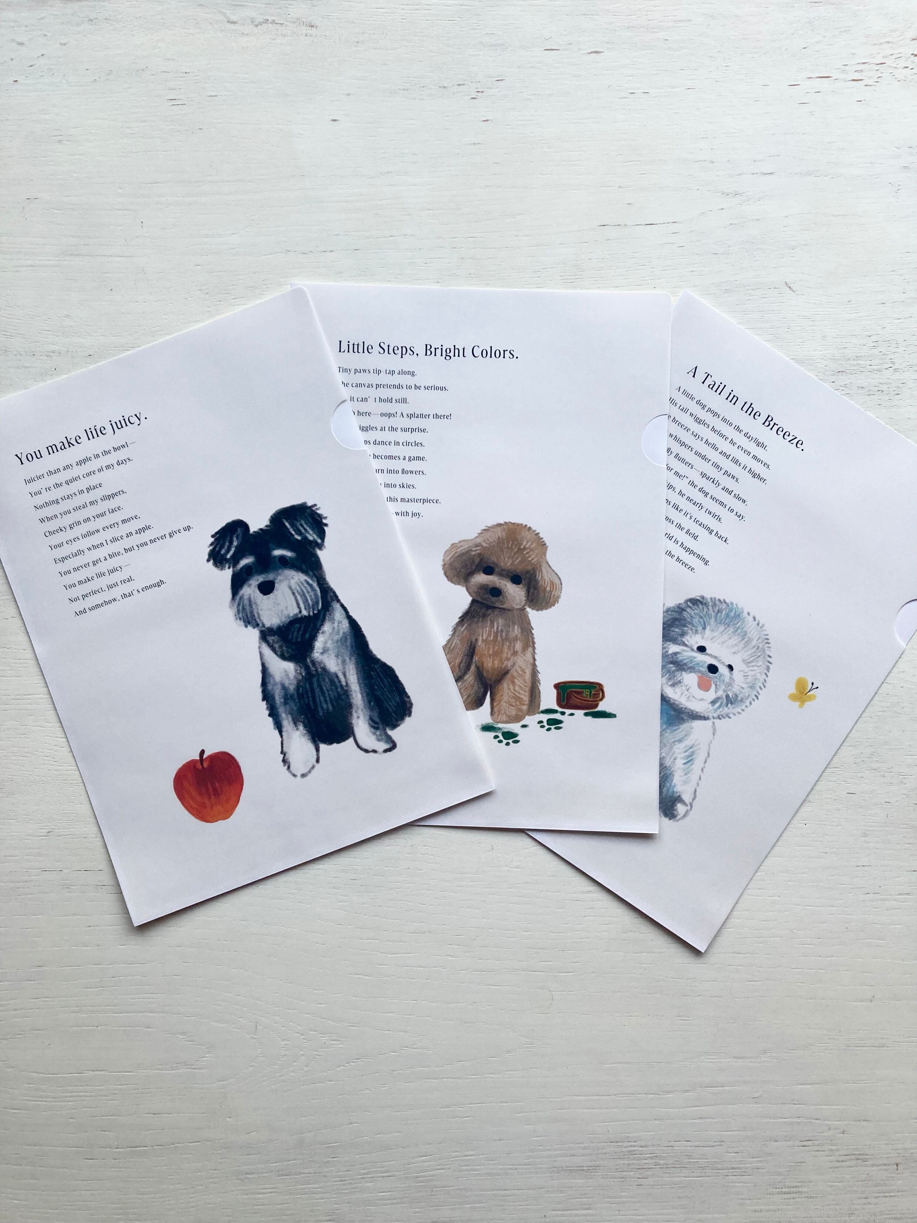 シュナウザー、トイプードル、ビション・フリーゼの3枚セット。透ける紙の質感を活かしたデザインで、中に入れた書類がうっすら見える機能性と、愛犬家にはたまらない可愛さを両立しました。