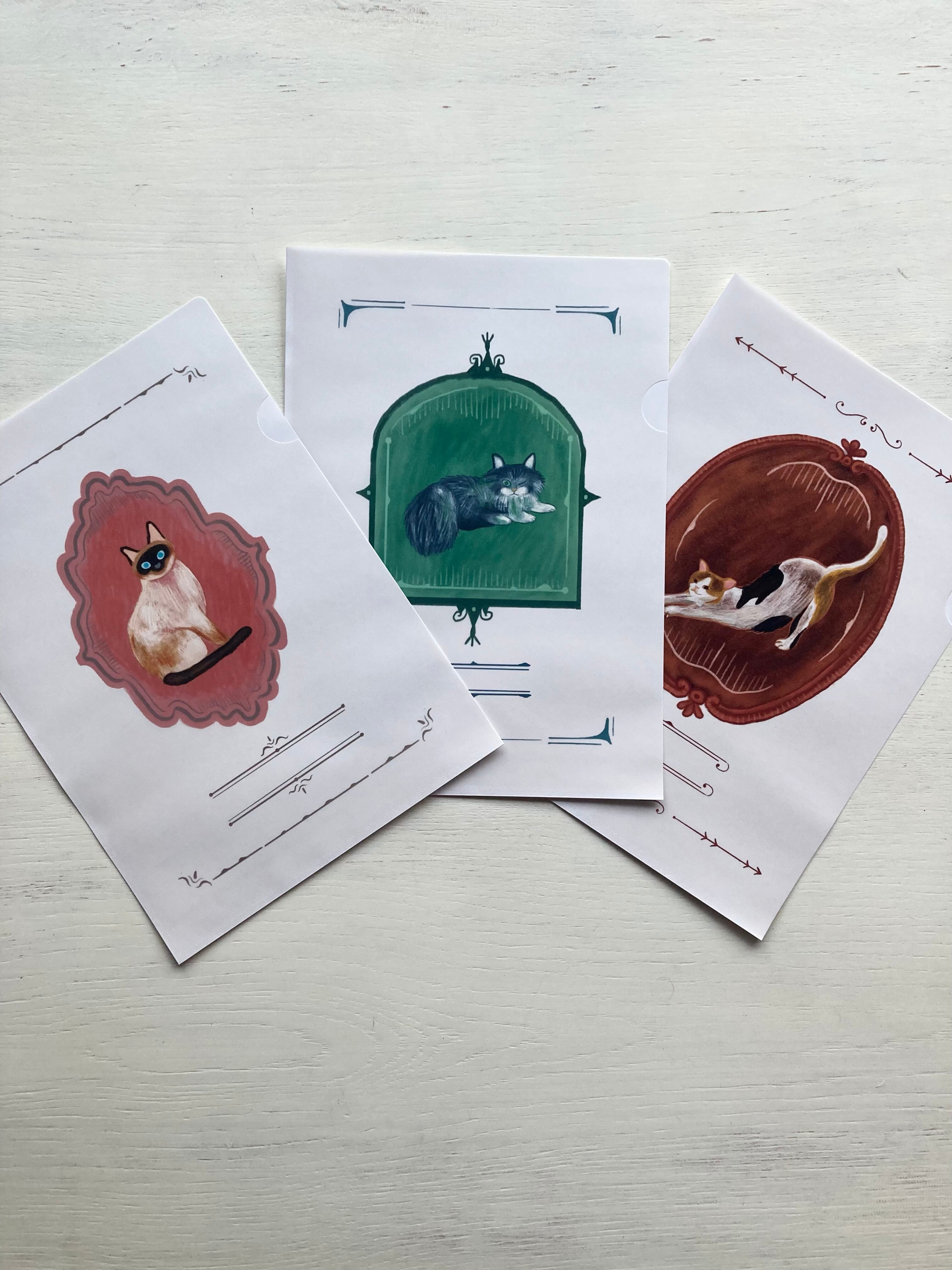 紙製のファイルで、新しいものが好きな方にぴったりのアイテム。やわらかいタッチの3種の猫のイラストが、気持ちをほっこり和らげてくれます。猫の種類は「シャム」「ノルウェージャンキャット」「三毛猫」の3枚セット。紙ならではの肌触りの良さがあり、仕事・勉強・趣味など、さまざまな使用場面で心地良さを感じられます。封筒代わりに書類を挟んで渡しても。紙製なので鉛筆やペンでそのまま文字を書き込むことができ、機能性とデザイン性を兼ね備えています。色を塗ったりデコったり、楽しみかた・使いかたはいろいろ。また、書類をそのままシュレッダーできるため、分別の手間が省け、環境にも優しい商品です。