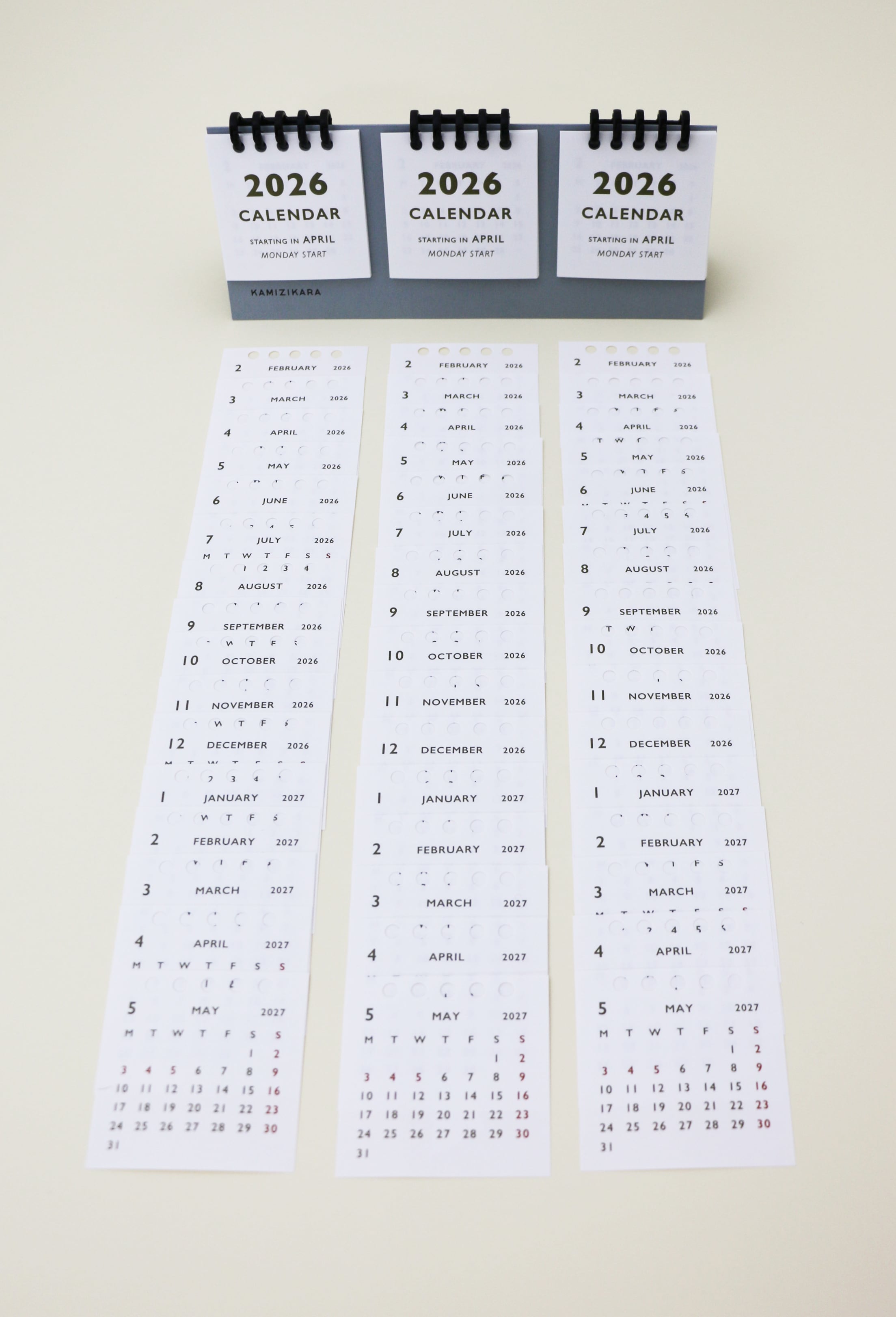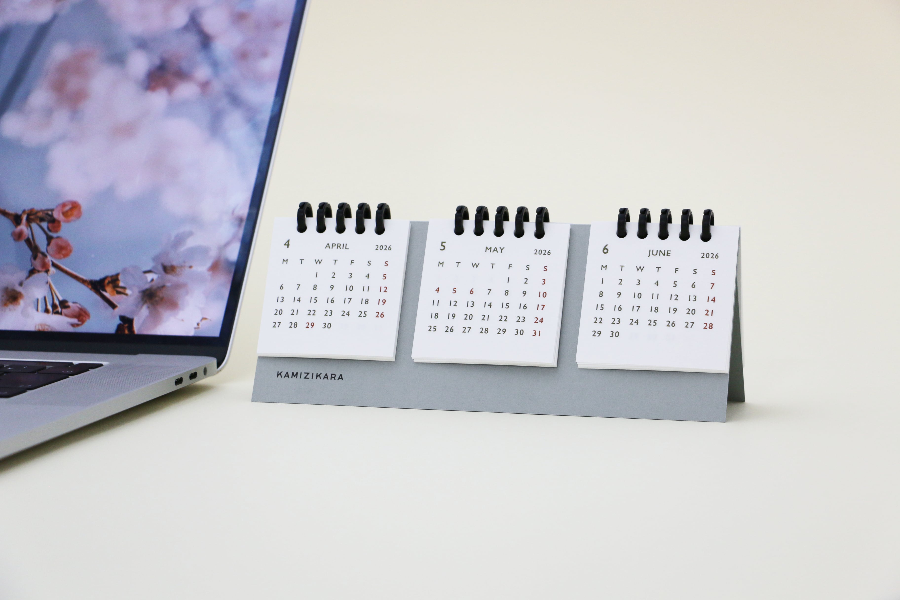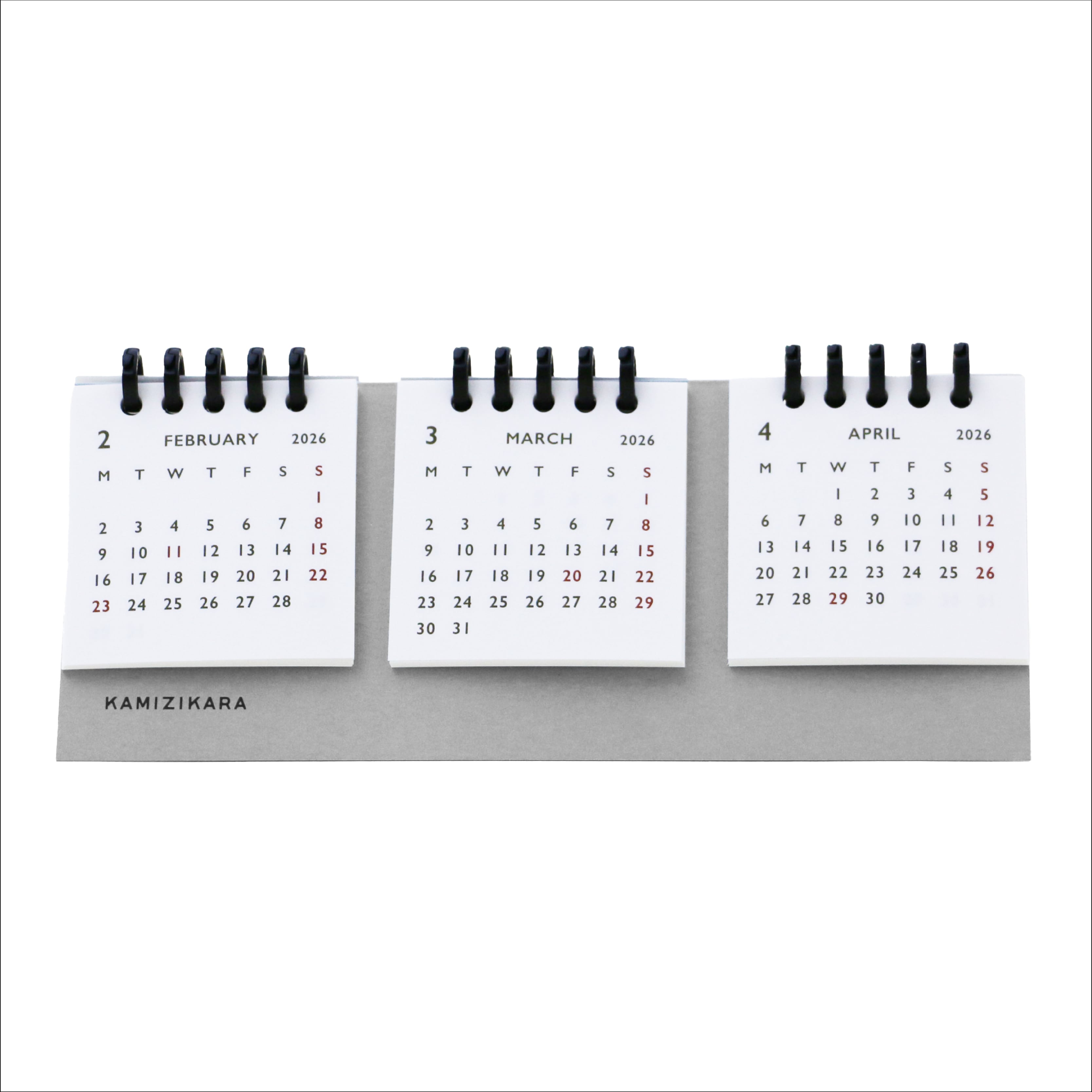 この卓上カレンダーは、2026年2月始まりの3か月分を同時に表示できる実用性に優れたアイテムです。新年度の4月に備えて、2月からご用意しました。また、お客様の声から、月曜始まりとして制作しました。暦が3列で表示されているため、予定を把握しやすく、使い方に応じて月を選んで表示できます。月が変わっても同じ場所に今月を固定できるので、見やすさ抜群です。