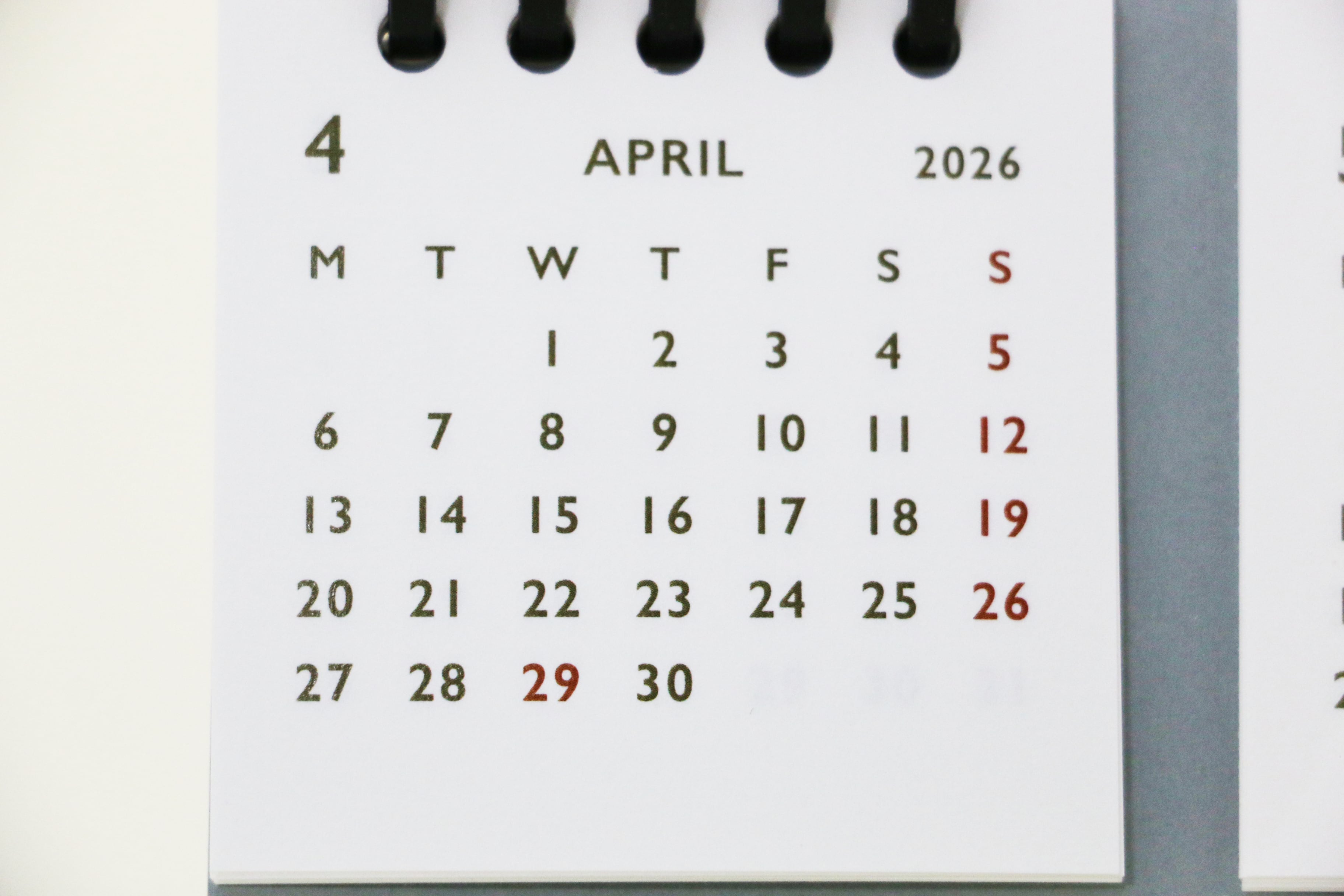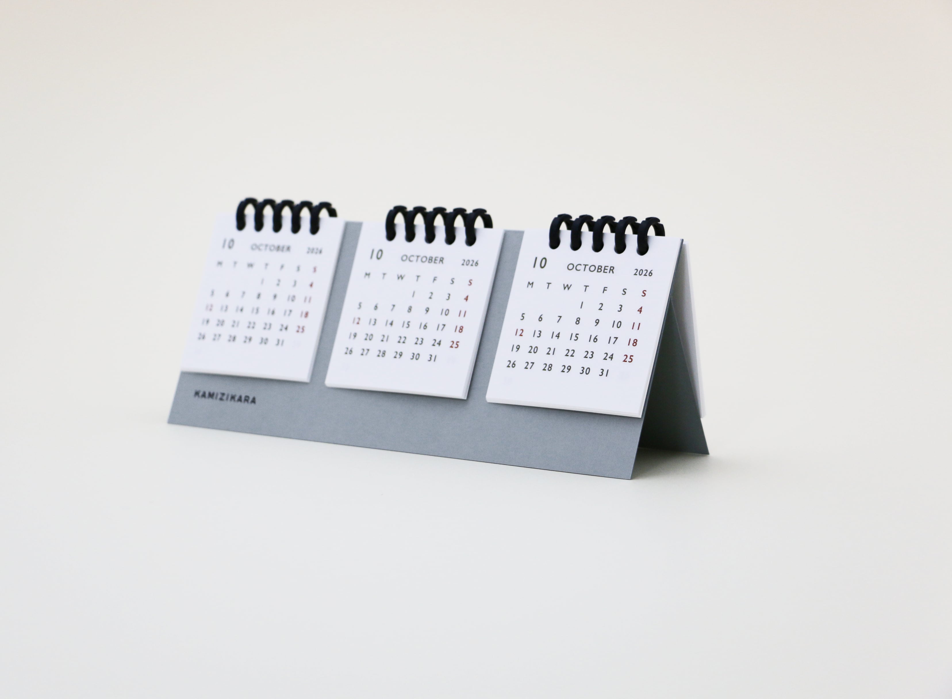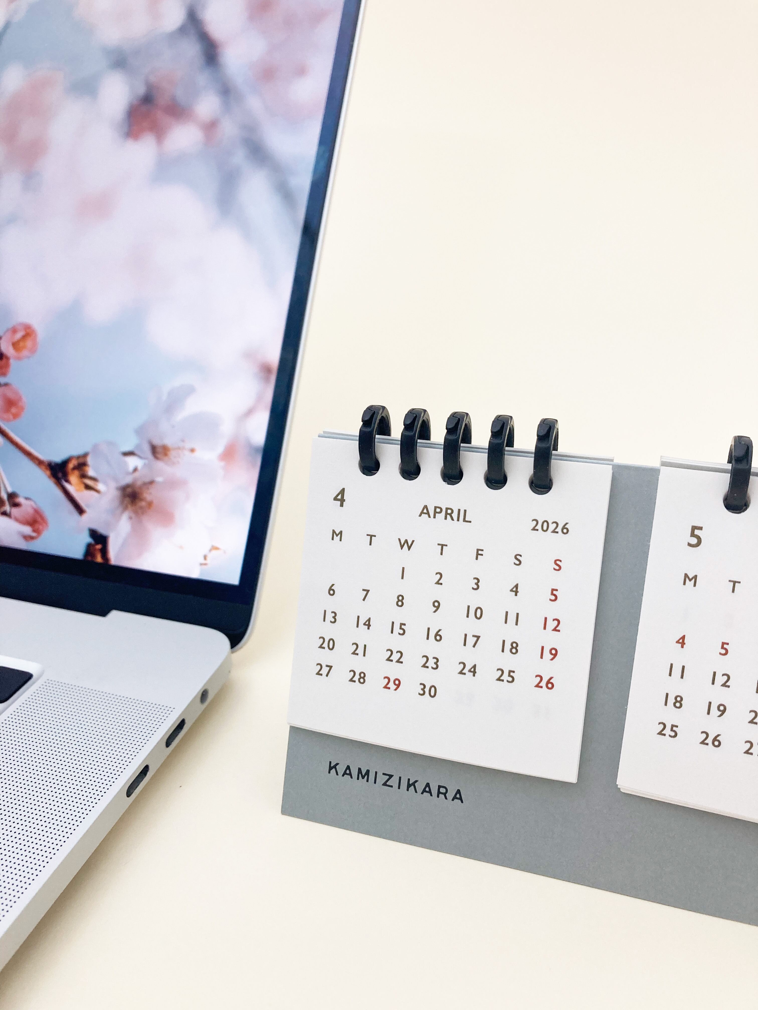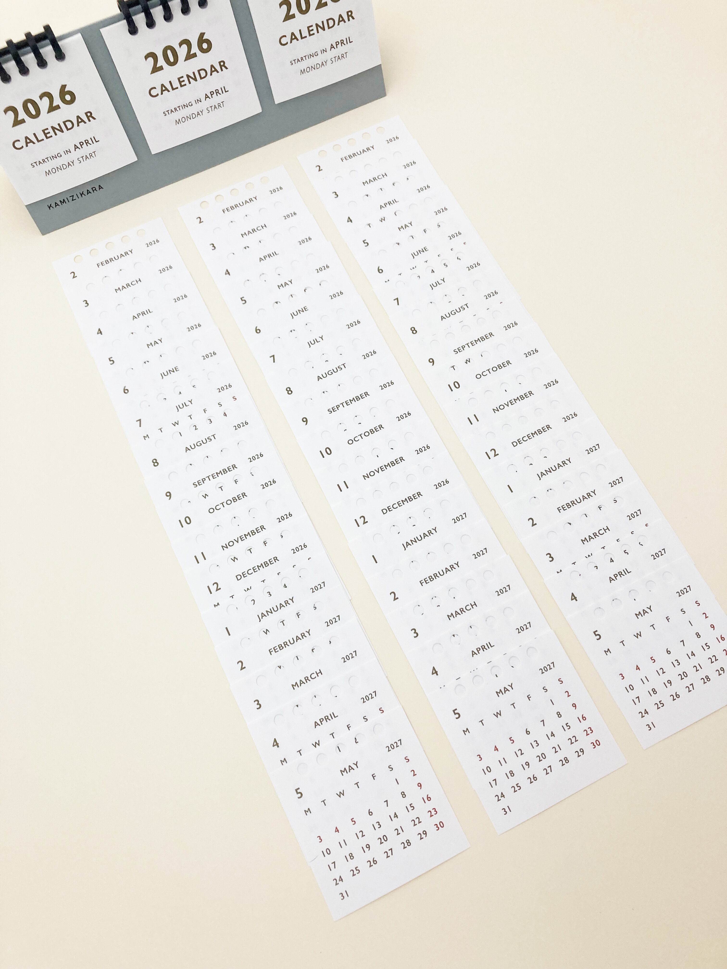 この卓上カレンダーは、2026年2月始まりの3か月分を同時に表示できる実用性に優れたアイテムです。新年度の4月に備えて、2月からご用意しました。また、お客様の声から、月曜始まりとして制作しました。暦が3列で表示されているため、予定を把握しやすく、使い方に応じて月を選んで表示できます。月が変わっても同じ場所に今月を固定できるので、見やすさ抜群です。