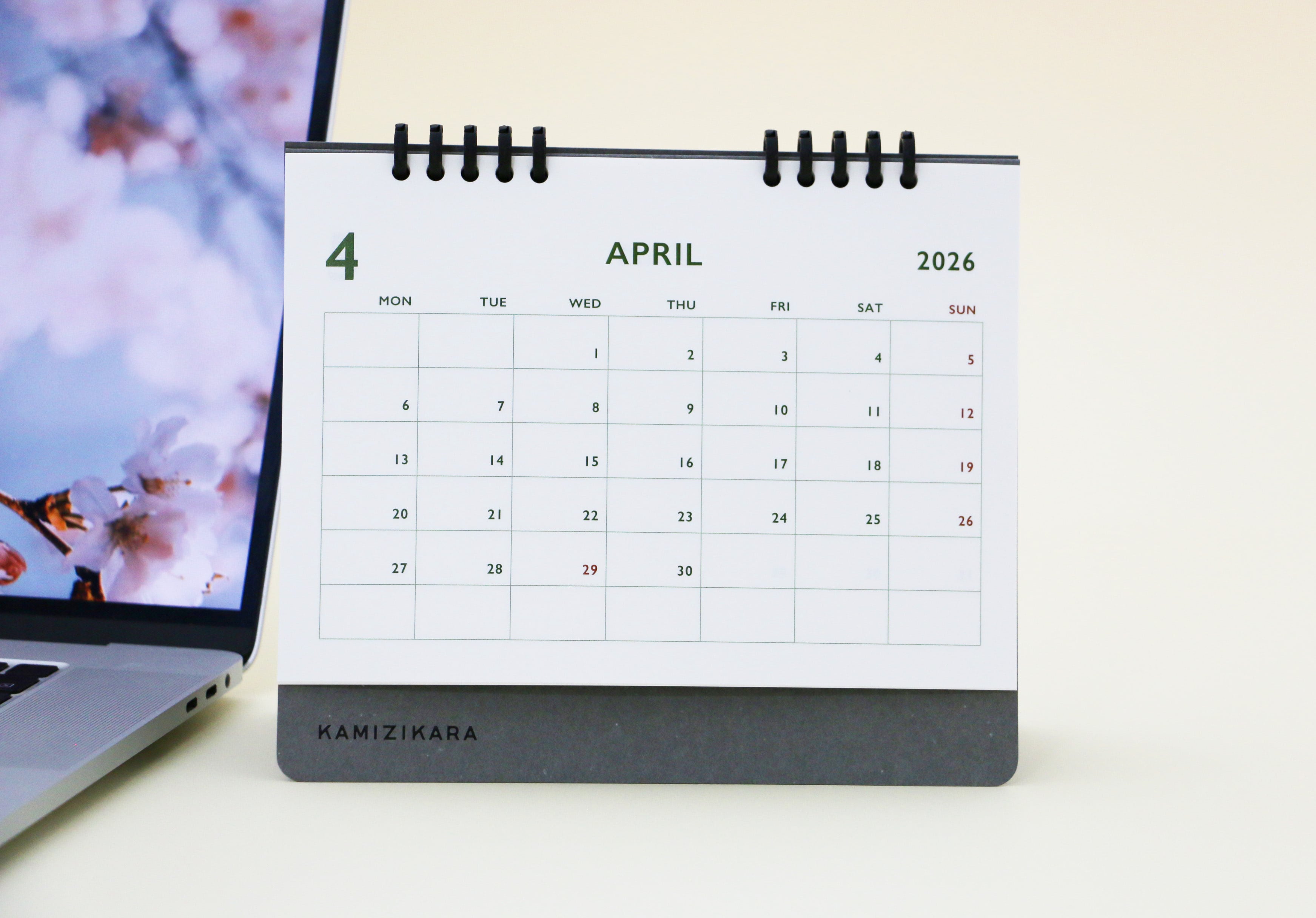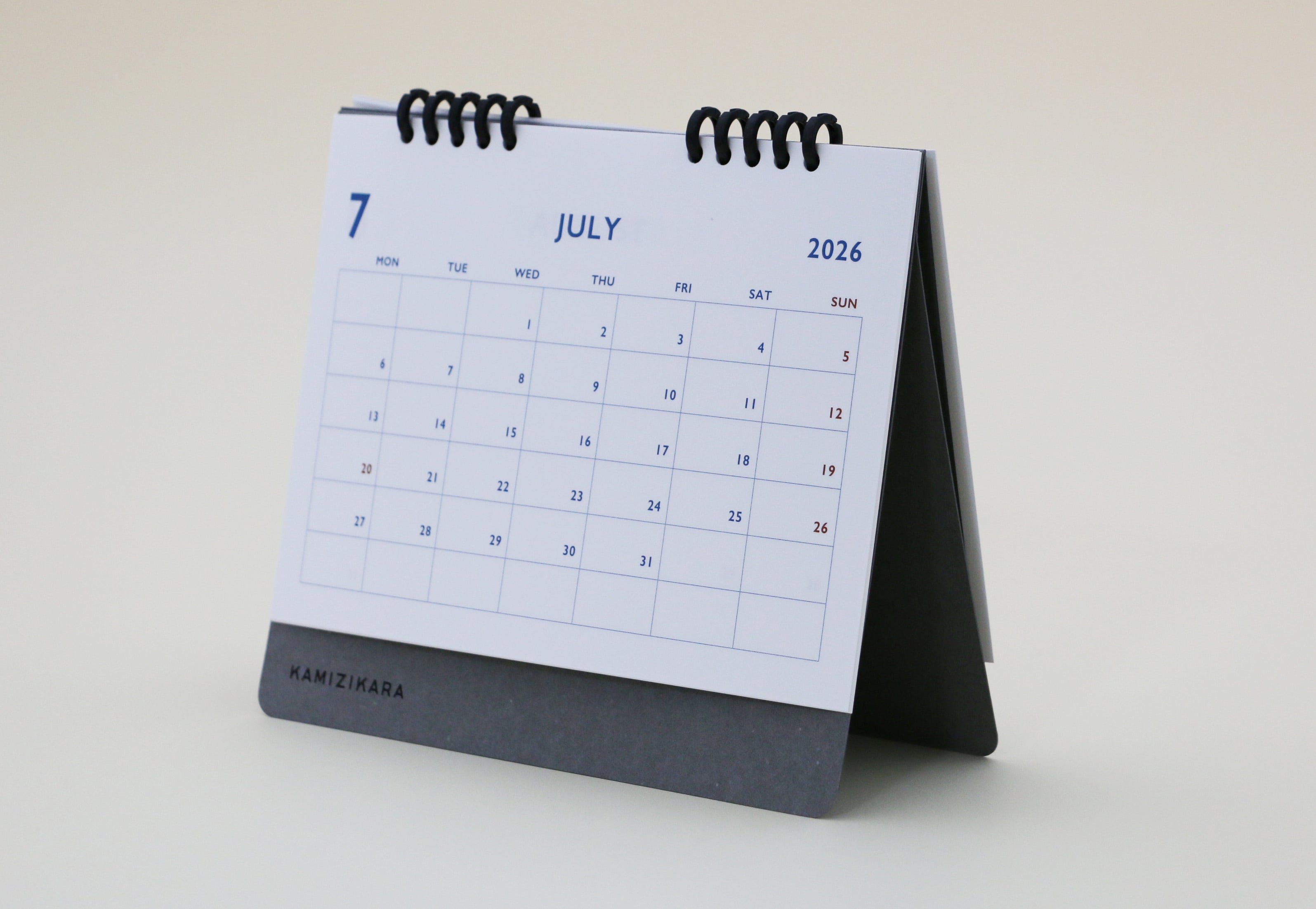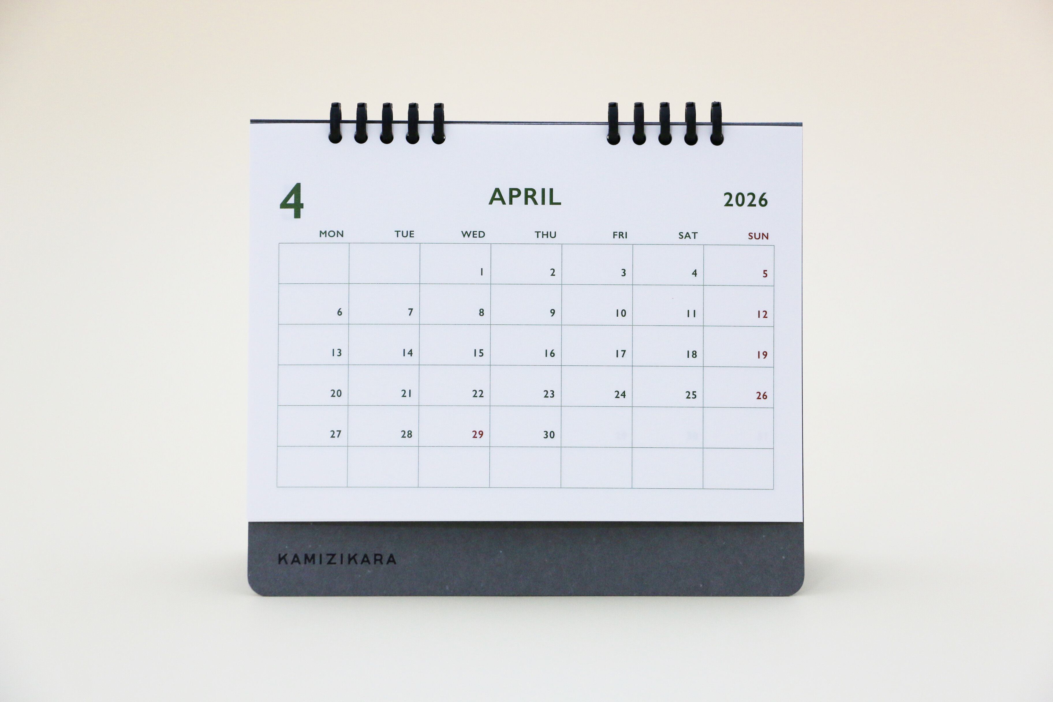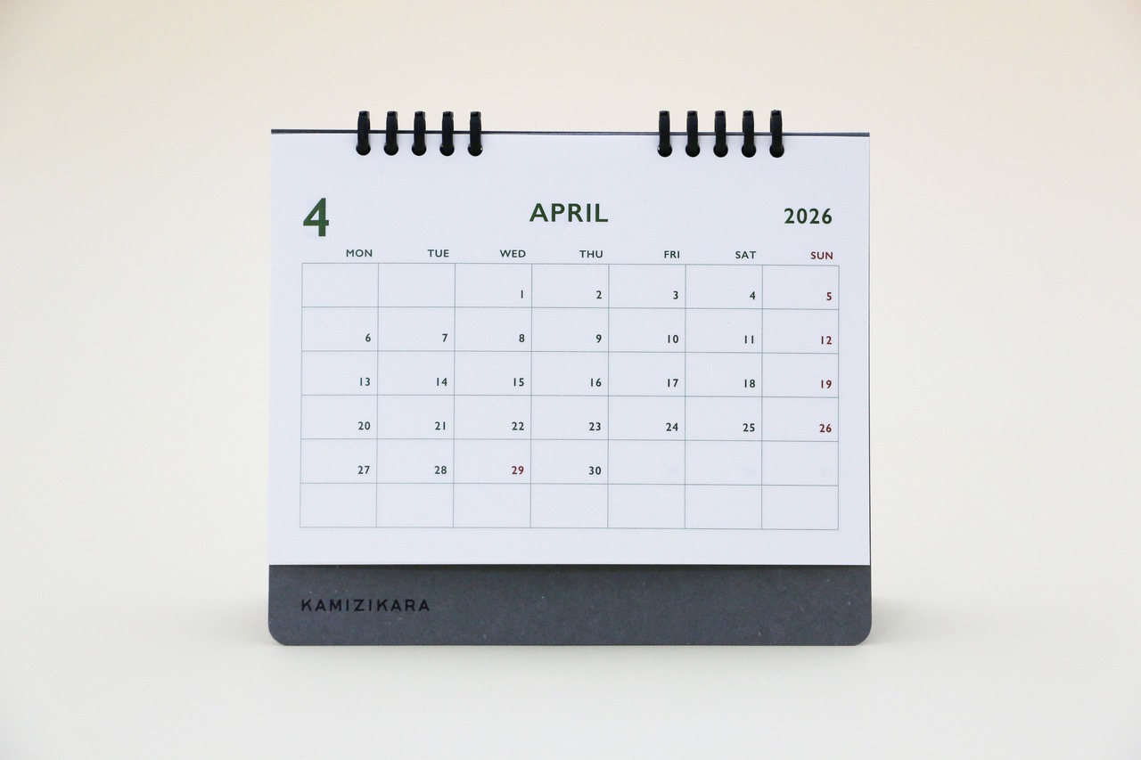 この卓上カレンダーは、2026年4月始まり・月曜始まりのシンプルながらもスタイリッシュなアイテムです。落ち着いた色合いのデザインは、どんな部屋のインテリアにも自然に溶け込みます。印刷された色ではなく、紙そのものの色を活かしたカレンダーなので、心地よい質感を楽しむことができます。